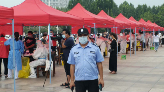 7日中午,烈日当空,河南轩振保安服务有限公司200余名保安队员提前到达核酸检测点现场,和社区工作人员一道对检测点的警戒带、指示牌和采样流程等工作布置安排进行最后的检查,主要任务是负责疏导交通、维持队伍秩序、接受各种询问求助,确保万无一失。