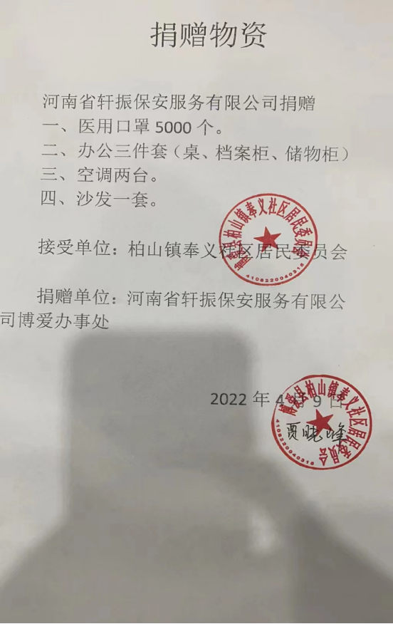 2022年4月9日,河南轩振保安服务有限公司驻博爱办事处向博爱县柏山镇奉义社区居民委员会捐赠了防疫物资和办公用品,表达了对一线抗疫工作者的诚挚问候,也展现了企业的社会责任和使命担当。
