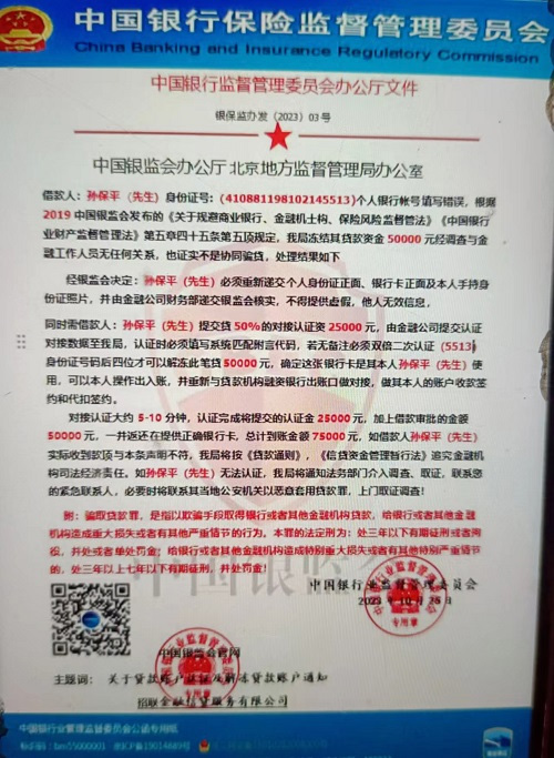 随后,一个微信昵称“龙哥”的人添加了孙某,两人开始通过网络聊天,“龙哥”用伪造的“中国银行保监管理委员会”的文件图片骗取了孙某信任,孙某补洗脑后,对“龙哥”的话深信不疑。决定给龙哥和“虚意”(龙哥和虚意很可能是同一个人)提供的三个账号转账两万五千元。