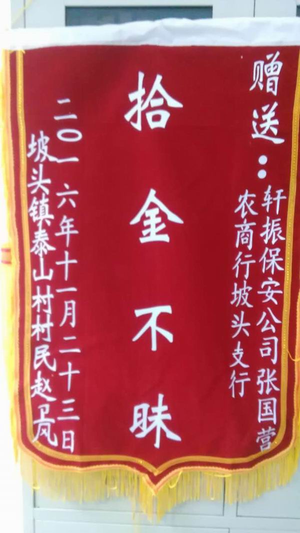 张国营深知在银行做保安,需要敏锐的观察能力,需要英勇果敢,但他认为更需要良好的金融操守,良好的金钱价值观,必须是始终如一的。有一次,张国营在下班回家的路上,路过泰山时,发现路上有一个黑色小包,打开一看,里面有现金6300元,还有两张卡和身份证、合作医疗本,此时,天已渐黑,四周也没有人,就算他装入自己口袋也没有人知道,但是坚定的职业操守告诉他,他不能这样做,当然他也不会这样做。于是第二天他就拿到银行,交给银行柜员人员查找到该客户,客户知道后激动又感谢,硬是拿出了300元给张国营以表谢意,张国营回绝了,他说:“你的钱也不是白拾的,我拿你的钱算啥,况且我是一名保安,这是我应该做的事情,我不能要”。那个客户激动的紧紧握住了张国营的手,许久许久.......